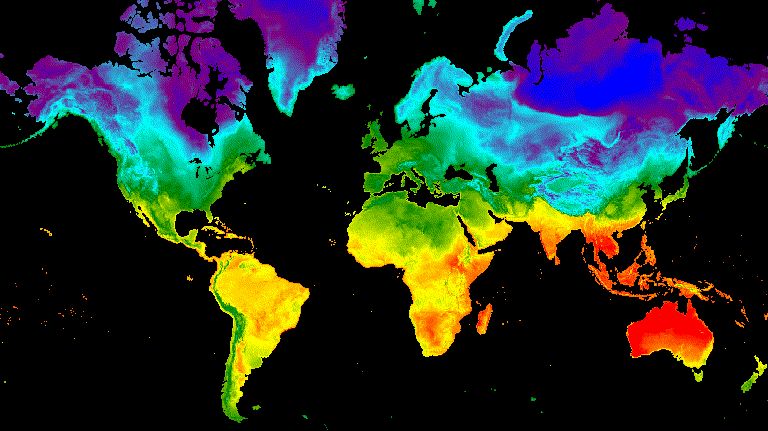 // Define an area of interest geometry with a global non-polar extent. var aoi = ee.Geometry.Polygon( [[[-179.0, 78.0], [-179.0, -58.0], [179.0, -58.0], [179.0, 78.0]]], null, false); // Import hourly predicted temperature image collection. var temp = ee.ImageCollection('NOAA/GFS0P25') // Define a northern summer solstice temperature image. var summerSolTemp = temp .filterDate('2018-06-21', '2018-06-22') .filterMetadata('forecast_hours', 'equals', 12) .first() .select('temperature_2m_above_ground'); // Define a northern winter solstice temperature image. var winterSolTemp = temp .filterDate('2018-12-22', '2018-12-23') .filterMetadata('forecast_hours', 'equals', 12) .first() .select('temperature_2m_above_ground'); // Combine the solstice images into a collection. var tempCol = ee.ImageCollection([ summerSolTemp.set('season', 'summer'), winterSolTemp.set('season', 'winter') ]); // Import international boundaries feature collection. var countries = ee.FeatureCollection('USDOS/LSIB_SIMPLE/2017'); // Define visualization arguments. var visArgs = { min: -40.0, max: 35.0, palette: ['blue', 'purple', 'cyan', 'green', 'yellow', 'red'] }; // Convert the image data to RGB visualization images. // The clip and unmask combination sets ocean pixels to black. var tempColVis = tempCol.map(function(img) { return img .visualize(visArgs) .clipToCollection(countries) .unmask(0) .copyProperties(img, img.propertyNames()); });