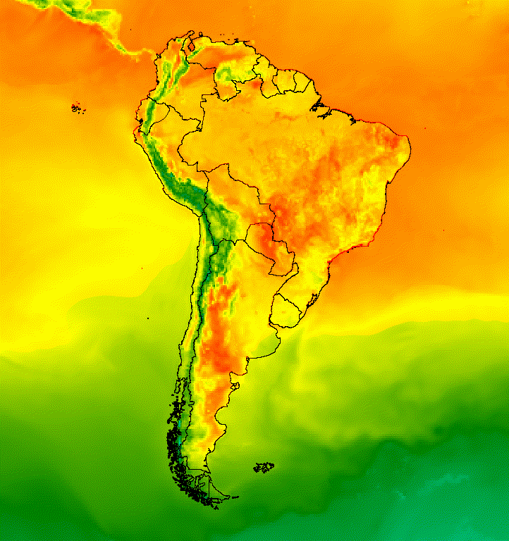 // Import hourly predicted temperature image collection for northern winter // solstice. Note that predictions extend for 384 hours; limit the collection // to the first 24 hours. var tempCol = ee.ImageCollection('NOAA/GFS0P25') .filterDate('2018-12-22', '2018-12-23') .limit(24) .select('temperature_2m_above_ground'); // Define visualization arguments to control the stretch and color gradient // of the data. var visArgs = { min: -40.0, max: 35.0, palette: ['blue', 'purple', 'cyan', 'green', 'yellow', 'red'] }; // Convert each image to an RGB visualization image by mapping the visualize // function over the image collection using the arguments defined previously. var tempColVis = tempCol.map(function(img) { return img.visualize(visArgs); }); // Import country features and filter to South American countries. var southAmCol = ee.FeatureCollection('USDOS/LSIB_SIMPLE/2017') .filterMetadata('wld_rgn', 'equals', 'South America'); // Define animation region (South America with buffer). var southAmAoi = ee.Geometry.Rectangle({ coords: [-103.6, -58.8, -18.4, 17.4], geodesic: false});