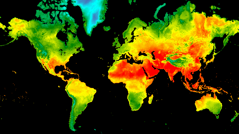 // Define an area of interest geometry with a global non-polar extent. var aoi = ee.Geometry.Polygon( [[[-179.0, 78.0], [-179.0, -58.0], [179.0, -58.0], [179.0, 78.0]]], null, false); // Import hourly predicted temperature image collection. var temp = ee.ImageCollection('NOAA/GFS0P25') // Define a northern summer solstice temperature image. var summerSolTemp = temp .filterDate('2018-06-21', '2018-06-22') .filterMetadata('forecast_hours', 'equals', 12) .first() .select('temperature_2m_above_ground'); // Define a northern winter solstice temperature image. var winterSolTemp = temp .filterDate('2018-12-22', '2018-12-23') .filterMetadata('forecast_hours', 'equals', 12) .first() .select('temperature_2m_above_ground'); // Combine the solstice images into a collection. var tempCol = ee.ImageCollection([ summerSolTemp.set('season', 'summer'), winterSolTemp.set('season', 'winter') ]); // Import international boundaries feature collection. var countries = ee.FeatureCollection('USDOS/LSIB_SIMPLE/2017'); // Define visualization arguments. var visArgs = { min: -40.0, max: 35.0, palette: ['blue', 'purple', 'cyan', 'green', 'yellow', 'red'] }; // Convert the image data to RGB visualization images. // The clip and unmask combination sets ocean pixels to black. var tempColVis = tempCol.map(function(img) { return img .visualize(visArgs) .clipToCollection(countries) .unmask(0) .copyProperties(img, img.propertyNames()); });