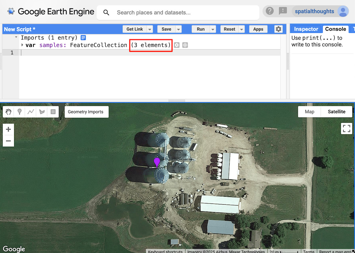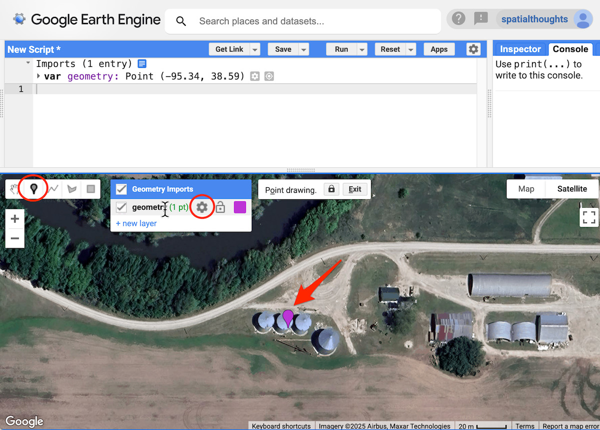 我们首先标记一个或多个谷仓的位置。在代码编辑器中,您可以使用卫星底图,以便轻松定位对象。