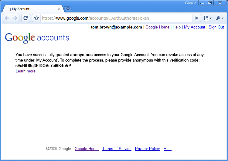 Используйте параметр xoauth_displayname в запросе OAuthGetRequestToken , чтобы указать имя вашего приложения. Если этот параметр не указан, Google отобразит доменное имя URL-адреса, указанного в параметре oauth_callback . Если URL-адрес обратного вызова не указан, Google отобразит строку "anonymous".
