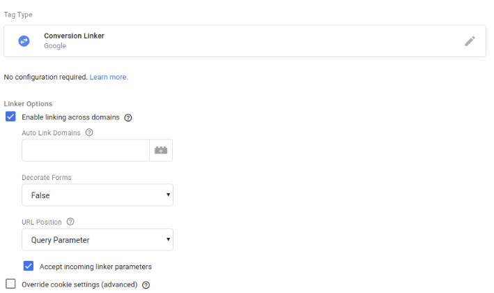 अगर आपकी साइट के पेजों पर मौजूद Tag Manager कोड स्निपेट, iframe, लिंक को कॉन्फ़िगर करना न भूलें इनकमिंग स्वीकार करने वाले डोमेन आपके कन्वर्ज़न लिंक करने वाले टैग के लिए लिंकर पैरामीटर चालू हैं.