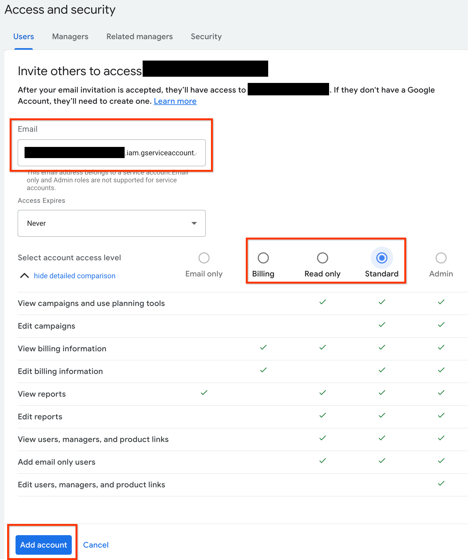 Введите адрес электронной почты учетной записи службы в поле «Электронная почта» . Выберите соответствующий уровень доступа к учетной записи и нажмите кнопку «Добавить учетную запись» .