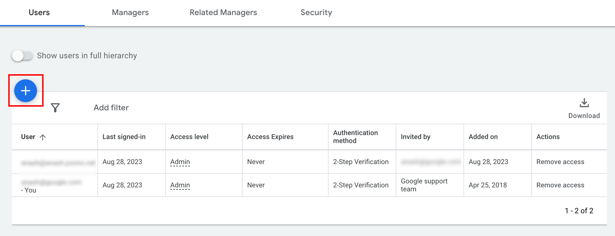 Разрешение на доступ к аккаунтам Google Ads не привязано к индивидуальным учетным данным пользователя, что может быть полезно в случаях, когда предполагается, что такое разрешение сохранится даже в случае ухода сотрудника, первоначально предоставившего доступ, из команды или компании.
