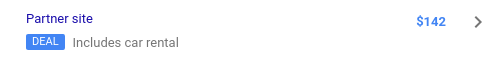 Google 會比對中繼資料與行程專屬資料,然後顯示廣告內容。系統會進行特殊處理,合併 <RoomData> 和 <PackageData> 元素中的名稱和說明,以便在 <RoomData> 中說明實體房型,並在 <PackageData> 中說明房價功能和套裝行程詳細資料。