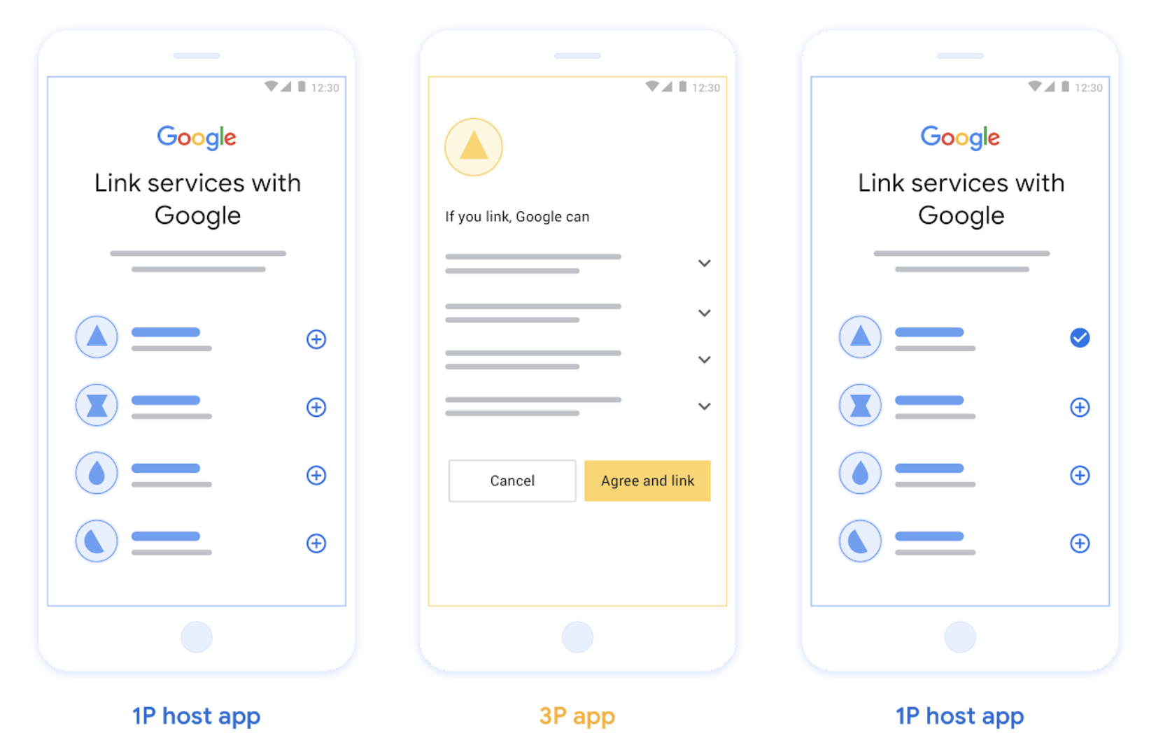 OAuth ベースのアプリ切り替えリンクでは、ユーザーが認証済みの Android または iOS モバイルアプリと Google のプラットフォームの間を移動して、提案されたデータアクセスの変更を確認し、プラットフォームのアカウントを Google アカウントにリンクすることに同意する手順が案内されます。アプリ切り替えを有効にするには、サービスが 認証コードフローを使用して OAuth リンクまたは OAuth ベースの Google でログインのリンクをサポートしている必要があります。