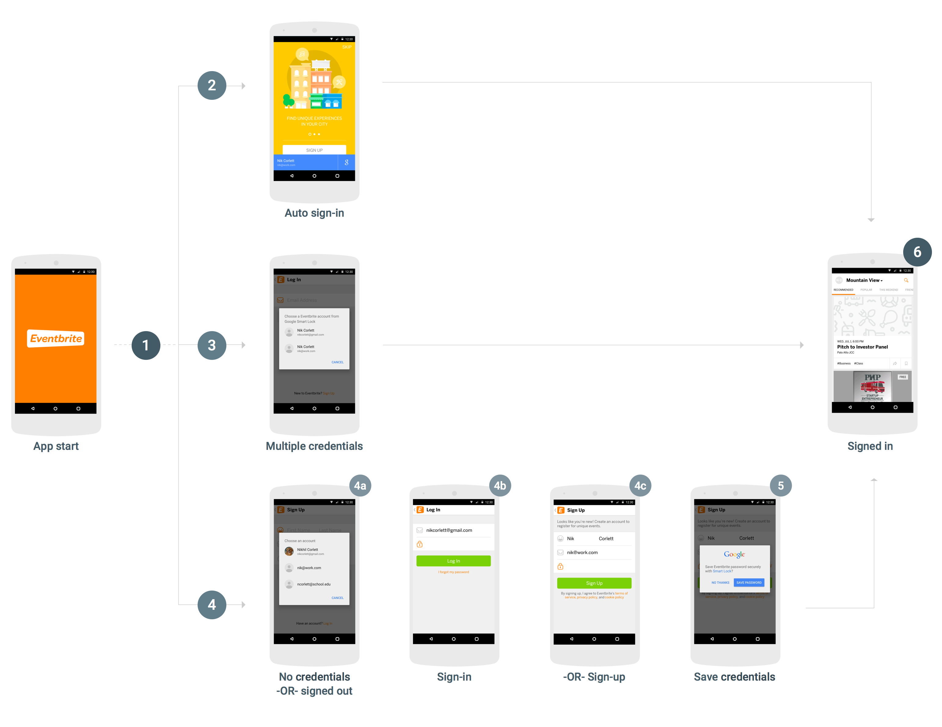 Embora existam muitas maneiras de integrar o Smart Lock para senhas, e as especificações de uma integração dependem da estrutura e da experiência do usuário do app, mas o fluxo a seguir é recomendado para a maioria dos apps. Os apps que usam esse fluxo têm estas vantagens na experiência do usuário: