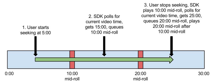광고 규칙을 사용하는 경우 클릭 후 드래그 탐색에 문제가 발생할 수 있습니다. 특히 사용자가 클릭 후 드래그하여 여러 미드롤 포드를 지나 동영상을 탐색하면 콘텐츠가 다시 시작되기 전에 이러한 포드가 2개 이상 연속으로 재생될 수 있습니다. 이는 사용자가 탐색하는 동안 동영상 재생 헤드 시간이 업데이트되기 때문에 발생합니다. 사용자가 광고를 지나 탐색하는 동안 SDK가 현재 시간을 폴링하는 경우 광고를 재생해야 한다고 생각할 수 있습니다. 콘텐츠가 다시 시작되면 해당 광고가 재생되고, 탐색 이후 가장 최근 광고가 재생됩니다. 이 문제의 시각적 표현은 다음 다이어그램을 참고하세요.