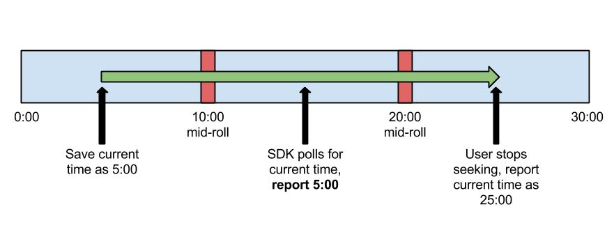 在用户开始搜索时保存当前时间,并在 SDK 请求该时间时报告该时间,直到用户恢复正常播放。如需直观了解此解决方案,请参阅下图:
