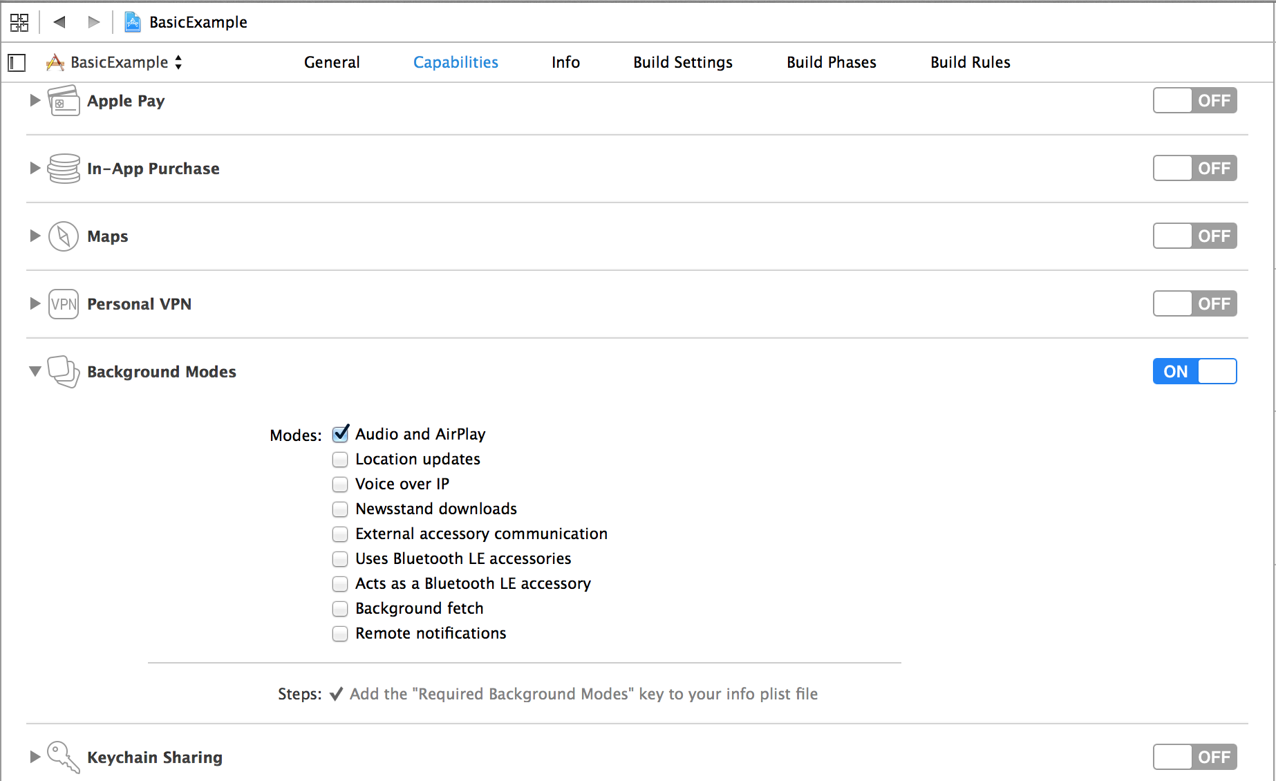1. فعِّل وضع الخلفية الصوت وAirplay. في Xcode 6، اختَر هدفًا، ثم ضمن الإمكانات >. أوضاع الخلفية: فعِّل خيار "الصوت وAirplay".