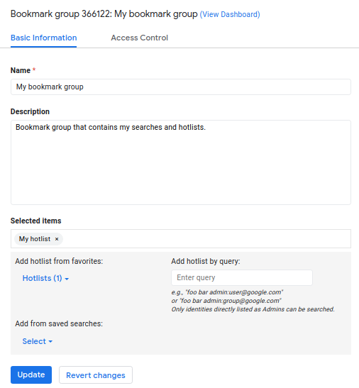 - 저장된 검색어를 북마크 그룹에 추가하려면 저장된 검색어의 관리자여야 합니다.