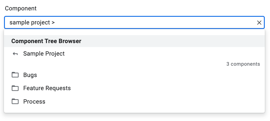 구성요소 계층 구조 Sample Project > Sample Project Bugs 상위 구성요소의 계층 구조에서 지정된 구성요소까지