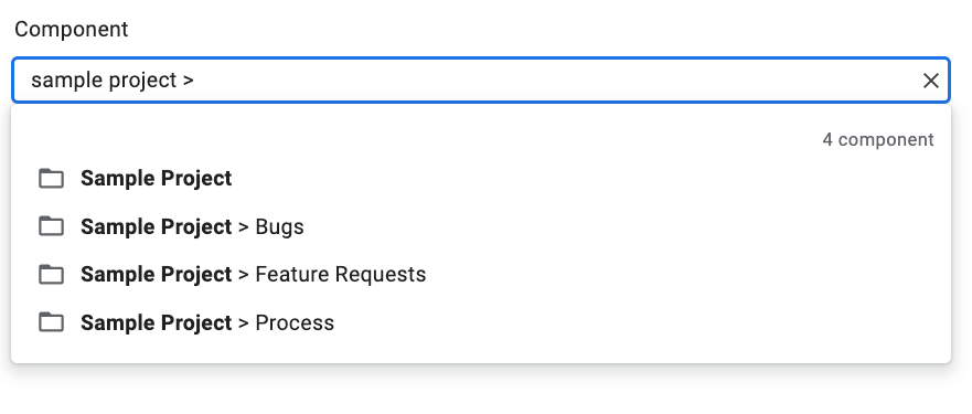 Issue Tracker는 사용자 인터페이스에서 구성요소를 지정할 수 있는 위치에 구성요소 검색 도구를 표시합니다. 구성요소 경로 또는 설명과 연결된 키워드를 입력하면 도구가 자동으로 구성요소 검색을 시작하고 드롭다운 목록에 순위가 매겨진 검색 결과를 표시합니다. 순위는 텍스트 일치 점수와 인기도를 조합하여 결정됩니다.