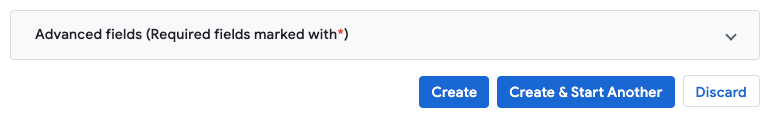 ऐडवांस फ़ील्ड पैनल को टॉगल करके, इन फ़ील्ड को देखा जा सकता है. ऐडवांस फ़ील्ड पैनल सिर्फ़ तब दिखता है, जब आपके पास समस्याओं में बदलाव करें की अनुमति हो. ज़्यादातर मामलों में, समस्या बनाते समय ऐडवांस फ़ील्ड छोड़े जा सकते हैं. हालांकि, कुछ कॉम्पोनेंट के लिए आपको वैल्यू डालनी होंगी. अगर ऐसा होता है, तो ऐडवांस फ़ील्ड सेक्शन अपने-आप दिखता है. साथ ही, ज़रूरी फ़ील्ड को स्टार (*) के निशान से मार्क किया जाता है.
