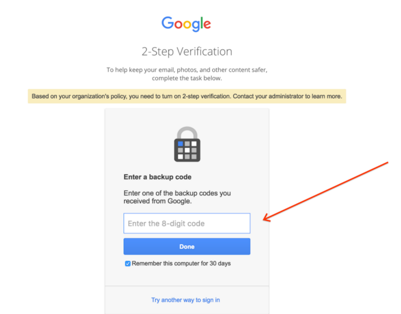 처음 로그인할 때 2단계 인증을 설정하지 않은 경우 후속 로그인 시 필요한 백업 코드를 제공할 수 없습니다. Google 담당자에게 새 백업 코드를 요청할 수 있습니다. 새 코드는 회사 이메일 계정으로 이메일로 전송됩니다.