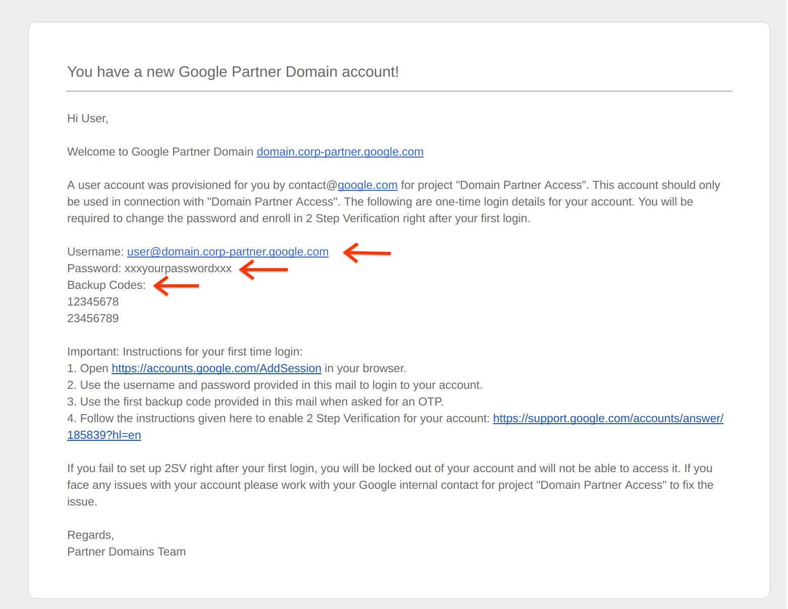 이 이메일에는 파트너 도메인 이메일 주소, 비밀번호, 백업 코드가 포함되어 있습니다. 또한 파트너 도메인 이메일 계정에 2단계 인증 (2SV)을 설정하는 방법에 관한 중요한 안내도 포함되어 있습니다.