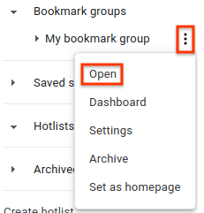 왼쪽 탐색 메뉴에서 북마크 그룹을 펼쳐 핫리스트 및 저장된 검색 목록을 볼 수도 있습니다.