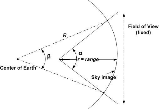 - est l'étendue angulaire de la vue dans Google Earth lorsque l'appareil photo est ramené au centre de la sphère céleste (Earth).