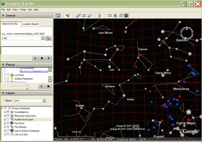 您必須執行一些簡單的計算,將右方上升座標 (小時/分鐘/秒) 轉換成經度,以便在 Google 地球 (天空模式) 正確顯示資料。