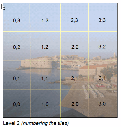 下圖說明 1000 萬像素圖片第 2 層的圖塊編號,來源位於左下角:
