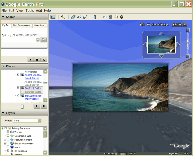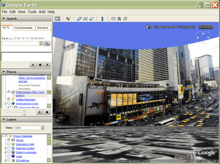 之前的 KML 版本可以讓您在「Google 地球」地標的附加說明框中加入小型相片。整張圖層 (例如 Panoramio) 都含有使用者提供及定位的地理位置相片。使用者必須先按一下地標圖示 (在「清單」面板中按一下名稱),才能開啟內含相片的氣球。