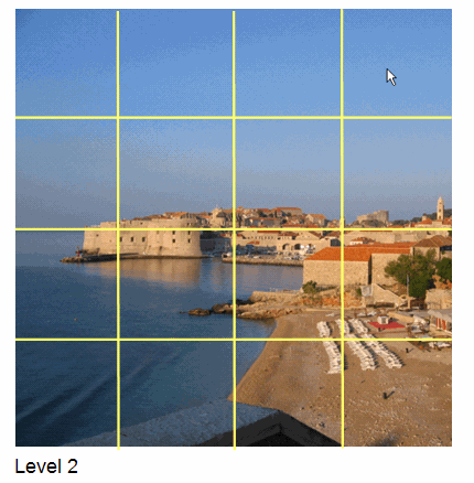 - Subdivida en mosaicos. En este nivel, la imagen consta de una cuadrícula de 2 × 2 mosaicos (nivel 1).