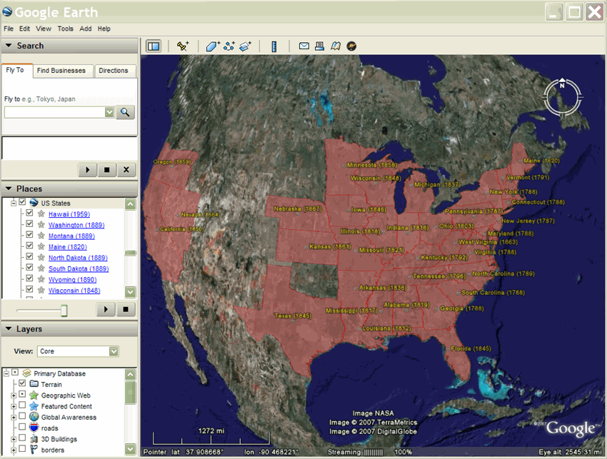 Firma Brian Flood stworzyła ciekawą prezentację KML z informacjami o rozwoju Stanów Zjednoczonych w miarę dodawania do niego związków. Wyświetlany tutaj plik KML wykorzystuje obiekty TimeSpan tylko z punktem początkowym, dzięki czemu stan (wielokąt) pozostaje na wyświetlaczu po jego dodaniu.