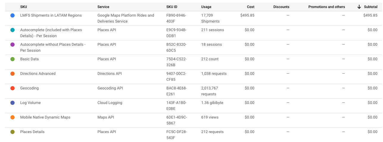 ระยะการผลิต: ระบบจะเรียกเก็บเงินจากคุณตามการเดินทางหรืองาน ค่าใช้จ่าย ที่เกี่ยวข้องกับ Google Maps Platform จะเกิดขึ้นก็ต่อเมื่อการใช้งานเกิน ขีดจำกัดการใช้งาน ("ขีดจำกัด") ของสัญญาเท่านั้น หากใช่ คุณจะต้องชำระค่าบริการ ส่วนเกิน ระบบจะเรียกเก็บเงินส่วนเกินตามที่กำหนดไว้ที่นี่
