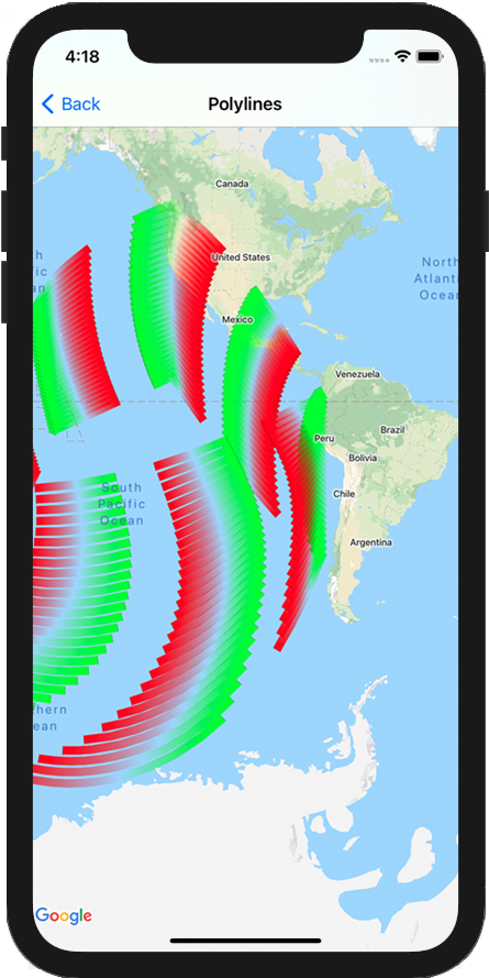 Pour créer une polyligne, vous devez spécifier son tracé en créant un objet GMSMutablePath correspondant avec au moins deux points. Chaque CLLocationCoordinate2D représente un point à la surface de la Terre. Des segments de ligne sont alors dessinés entre ces points dans l'ordre dans lequel vous les ajoutez au tracé. Vous pouvez ajouter des points au tracé à l'aide des méthodes addCoordinate: ou addLatitude:longitude:.