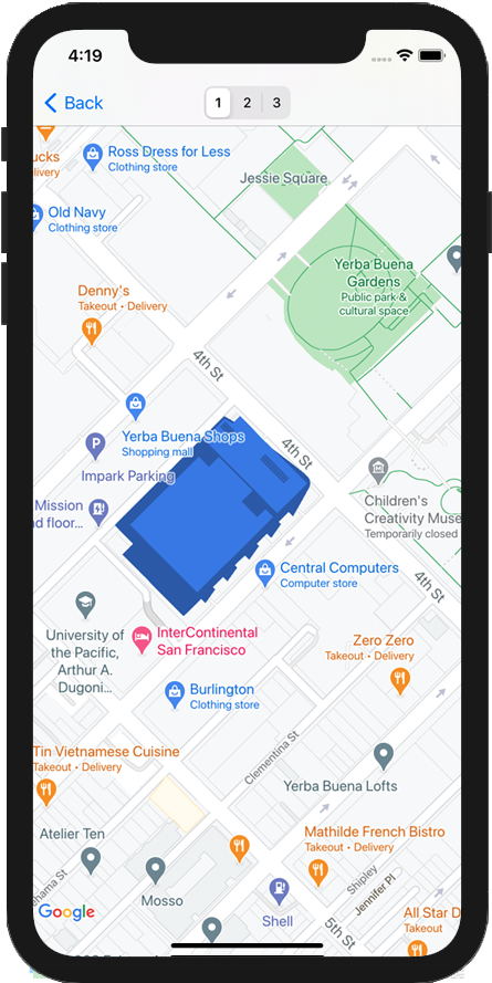 لا يتطلّب GMSURLTileLayer إنشاء فئة فرعية، ولكن عليك تنفيذ كتلة GMSTileURLConstructor. يوضّح الرمز البرمجي أدناه كيفية استخدام GMSURLTileLayer لعرض مخطط مبنى متعدّد الطوابق.