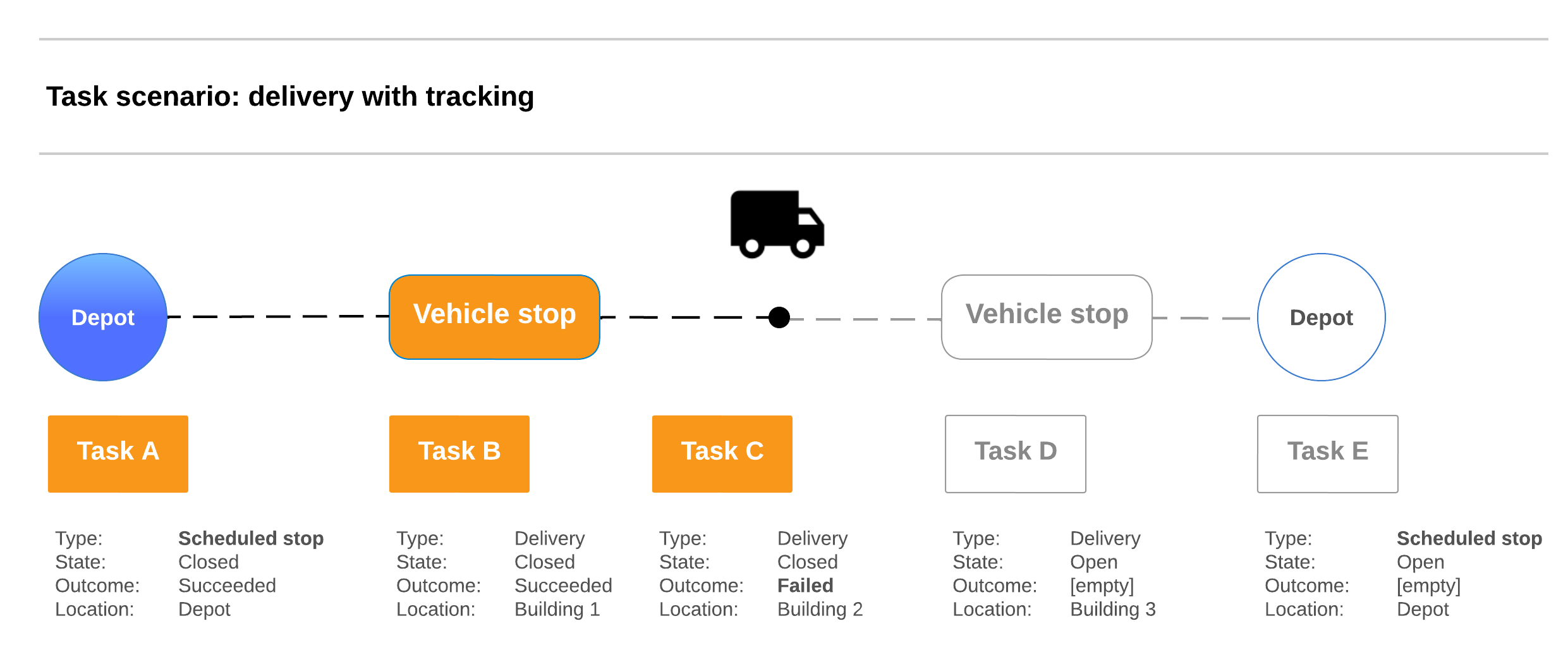 टास्क की स्थिति 'प्रोसेस नहीं हुए हैं' या 'प्रोसेस हो गए हैं' में से एक होती है. हालांकि, किसी वाहन को टास्क असाइन करने के बाद, वाहन के साथ असाइन किए गए टास्क की प्रोग्रेस को ट्रैक किया जा सकता है. साथ ही, यह भी देखा जा सकता है कि वाहन उस स्टॉप के कितने करीब है जहां टास्क पूरा करना है.