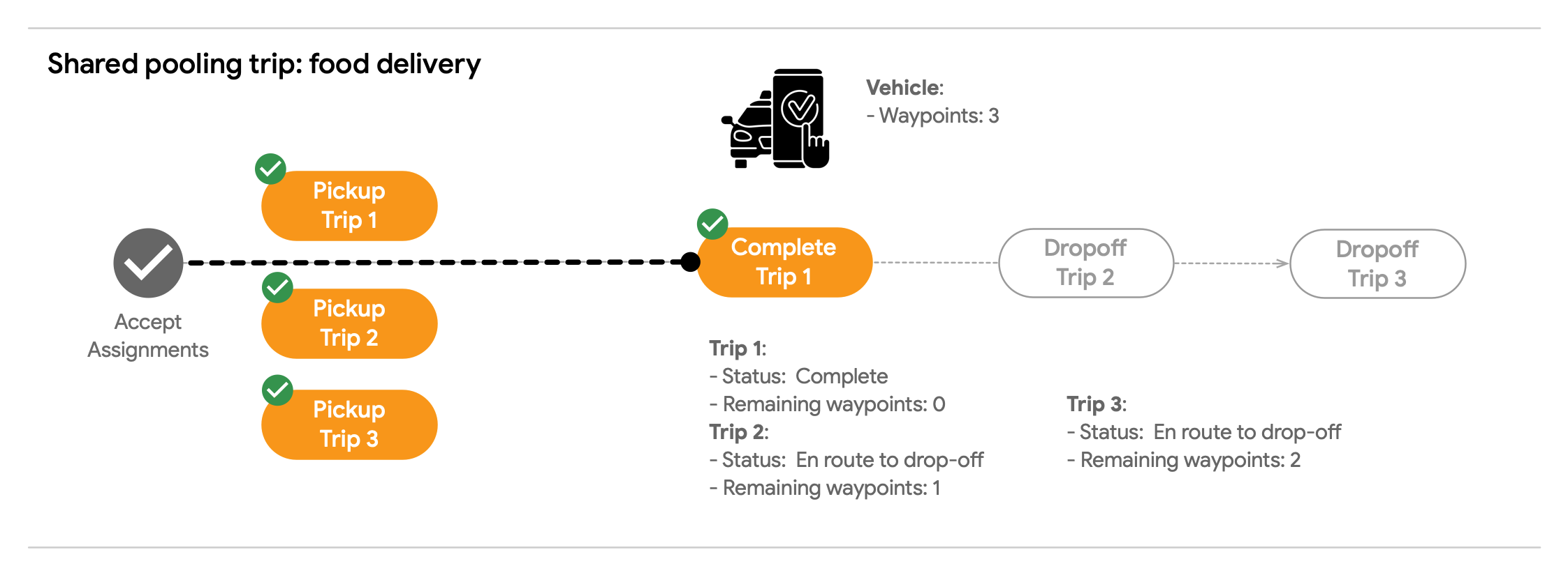 remaining_waypoints的欄位。其中包含車輛必須依序前往的路線點,才能抵達行程的最終下車點。請參閱「行程情境」中的情境。- 對於指派給車輛的單一目的地行程,且該車輛在其行程表中沒有其他行程,則只會包含上車和下車地點,假設車輛未離開上車路徑點。