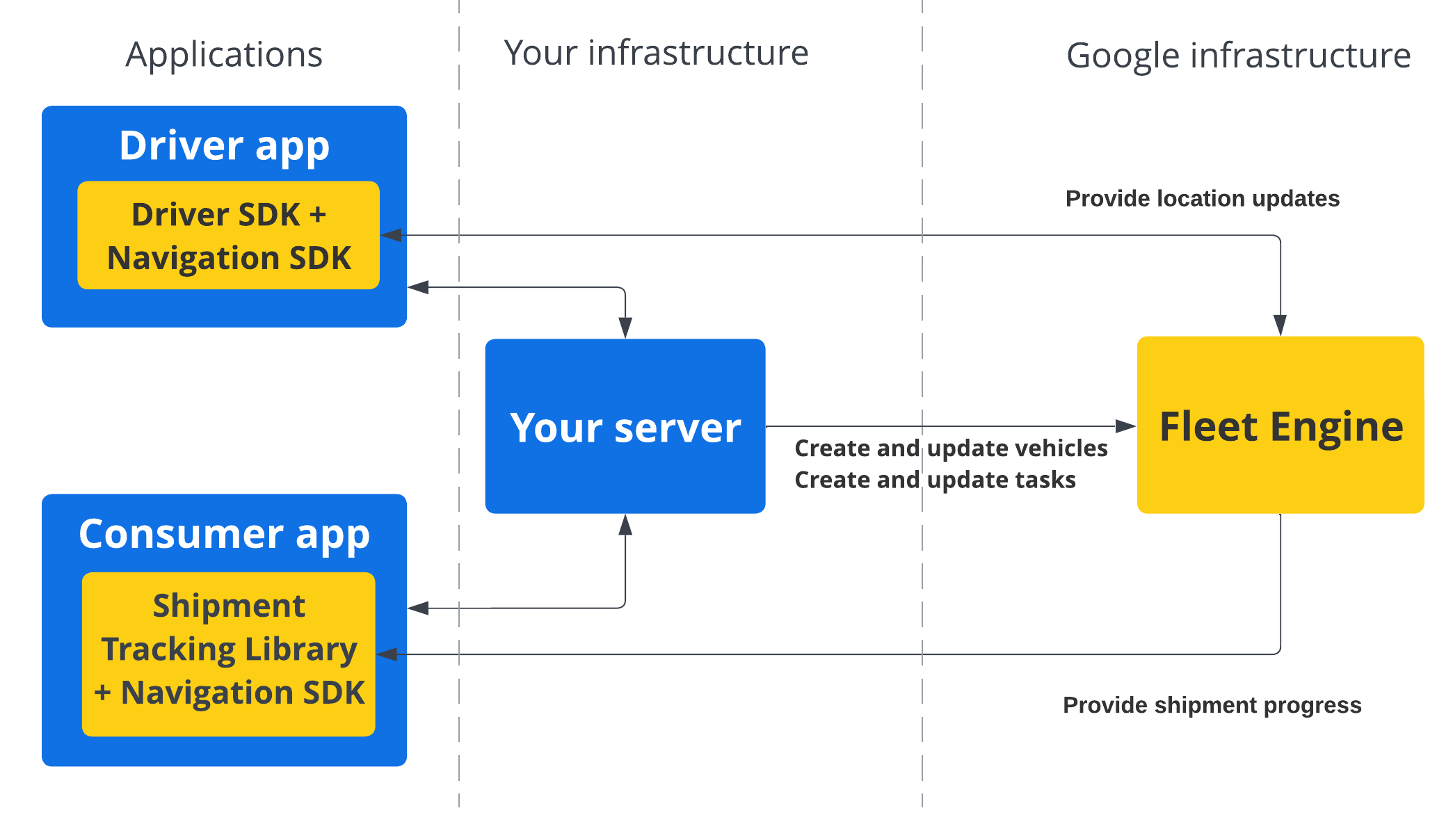 Fleet Engine è un servizio di backend che si integra con il sistema che utilizzi per gestire i servizi di trasporto per i tuoi clienti. Interagisce con una varietà di API e SDK per migliorare la mappatura, la pianificazione degli itinerari e la gestione della posizione.