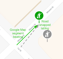 Pakiet Navigation SDK wybiera odcinek drogi najbliższy punktowi pośredniemu, który ma kierunek pasa ruchu zgodny (w zakresie +/- 55 stopni) ze stroną drogi, na której znajduje się punkt pośredni.