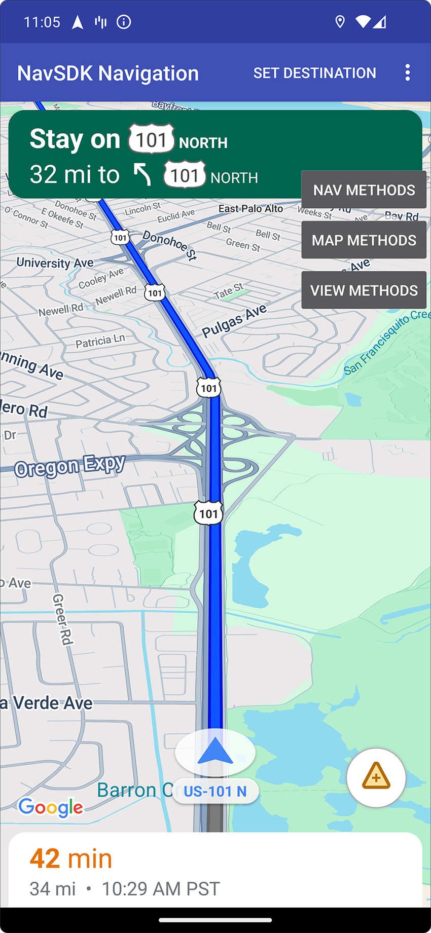 Klicken Sie zum Starten auf Ziel festlegen und wählen Sie eine Adresse aus. Die App simuliert dann eine Fahrt von Ihrem aktuellen Standort zu dieser Adresse. Mit dem Overlay für die Steuerfelder können Sie sehen, was passiert, wenn Sie eine API aufrufen. Klicken Sie beispielsweise auf View Methods (Methoden ansehen), um das SDK in den Nachtmodus zu zwingen und zu sehen, wie es aussieht.