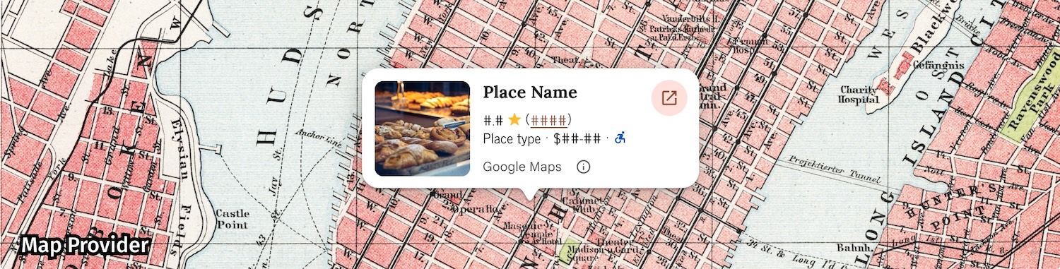 ชุดเครื่องมือ UI ของ Places มีแนวทางระบบการออกแบบสำหรับการปรับแต่งภาพโดยอิงตาม Material Design โดยประมาณ (มีการแก้ไขบางอย่างที่เฉพาะเจาะจงสำหรับ Google Maps) ดูข้อมูลอ้างอิงของ Material Design สำหรับสีและการพิมพ์ โดยค่าเริ่มต้น สไตล์จะเป็นไปตามภาษาการออกแบบภาพของ Google Maps
