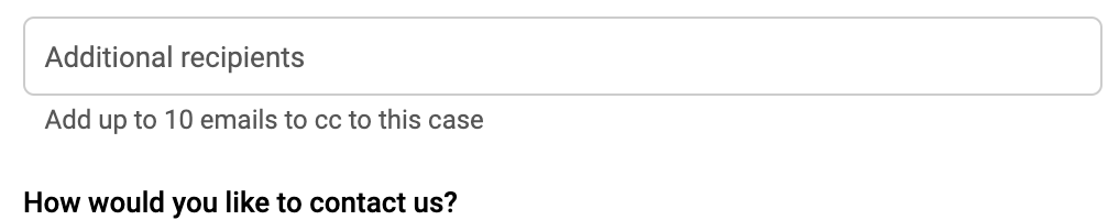 Diğer kullanıcıların açık bir destek kaydını görmesini veya bu kayda katılmasını istiyorsanız Cloud Console'daki Destek Kaydı Oluştur sayfasında bulunan Ek alıcılar alanını kullanarak bu kullanıcıları e-posta ileti dizisine ekleyin.