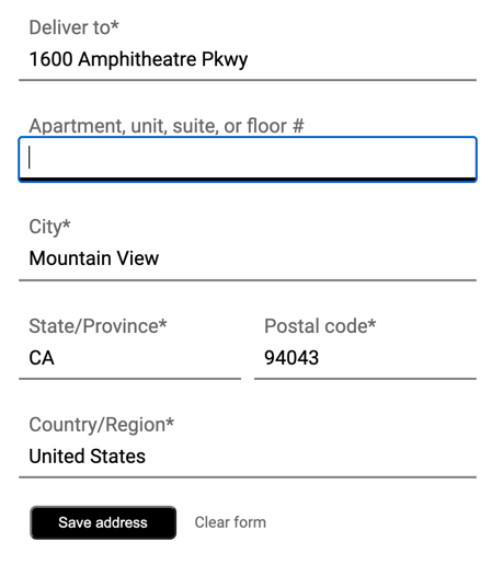 - اترك الحقول قابلة للتعديل في حال عدم تطابق حقول معيّنة، واسمح للعملاء بتعديل العنوان إذا لزم الأمر. بما أنّ معظم العناوين التي تعرِضها ميزة "الإكمال التلقائي للأماكن" لا تحتوي على أرقام المواقع الفرعية، مثل أرقام الشقق أو الأجنحة أو الوحدات، ينقل هذا المثال التركيز إلى سطر العنوان 2 لتشجيع المستخدم على ملء هذه المعلومات إذا لزم الأمر.