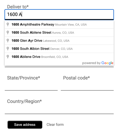 Mit Place Autocomplete lässt sich die Adresseingabe in Ihrer Anwendung vereinfachen, was zu höheren Conversion-Raten und einem nahtlosen Ablauf für Ihre Kunden beiträgt. Über die Funktion wird ein einzelnes Feld für die schnelle Eingabe zur Verfügung gestellt, in dem die Adresse beim Tippen automatisch vervollständigt wird. Sie kann zum Ausfüllen eines Formulars für die Rechnungs- oder Versandadresse verwendet werden.