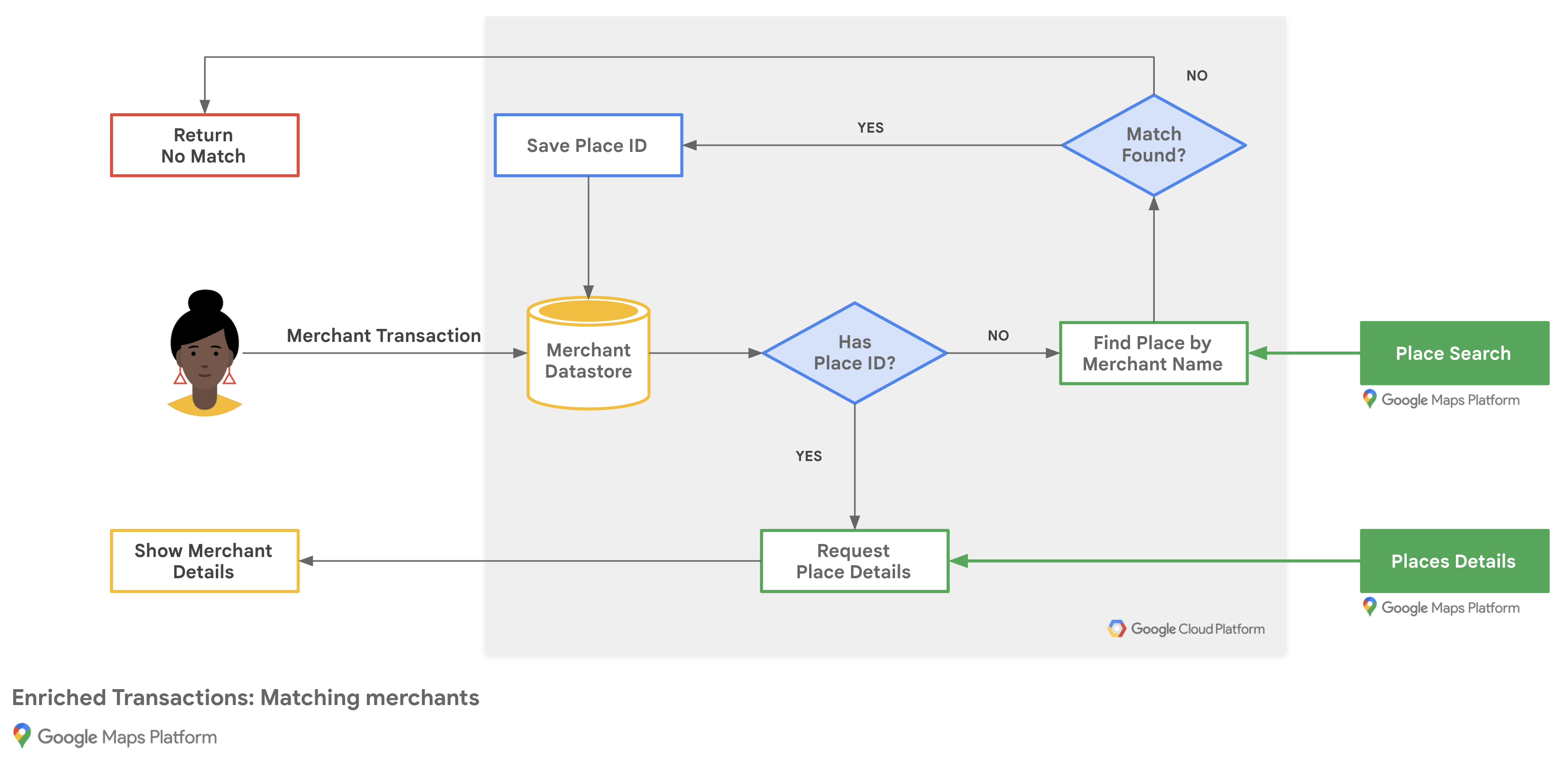 Sơ đồ sau đây cho thấy cách ứng dụng của bạn so khớp các giao dịch của người bán để trả về kết quả bằng cách sử dụng Thông tin chi tiết về địa điểm từ cơ sở dữ liệu người bán hiện có hoặc thông qua yêu cầu Tìm kiếm địa điểm: