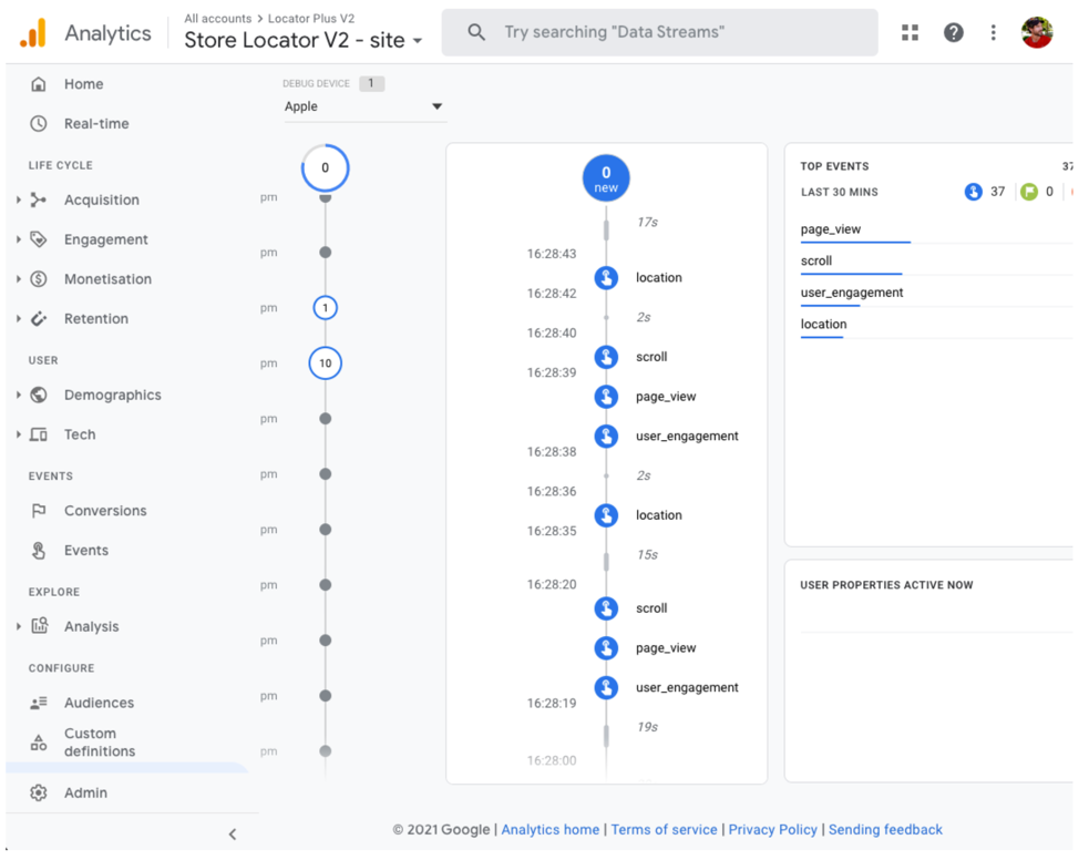 يمكنك التأكّد من تسجيل علامات الأحداث المخصّصة بشكلٍ صحيح من خلال عرض ملف الاطّلاع "الوقت الفعلي" في "إحصاءات Google". على سبيل المثال، يظهر الحدث "الموقع الجغرافي" الذي تم إعداده سابقًا لميزة إكمال الأماكن تلقائيًا في "إحصاءات Google" كما هو موضّح في الأشكال التالية.