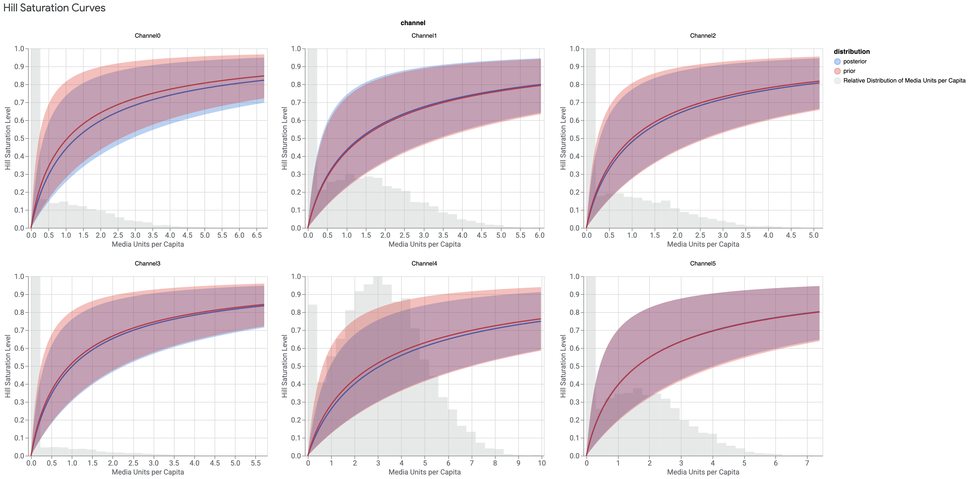 Diese Kurven zeigen die Abklingrate der Media-Effekte, wobei der monotone Adstock-Verfall, den Meridian verwendet, den höchsten Effekt am ersten Tag hat. Wenn der Posterior höher als der Prior ist, dann halten die Effekte der Auslieferung einer Anzeige auf diesem Media-Channel länger an als ursprünglich angenommen.