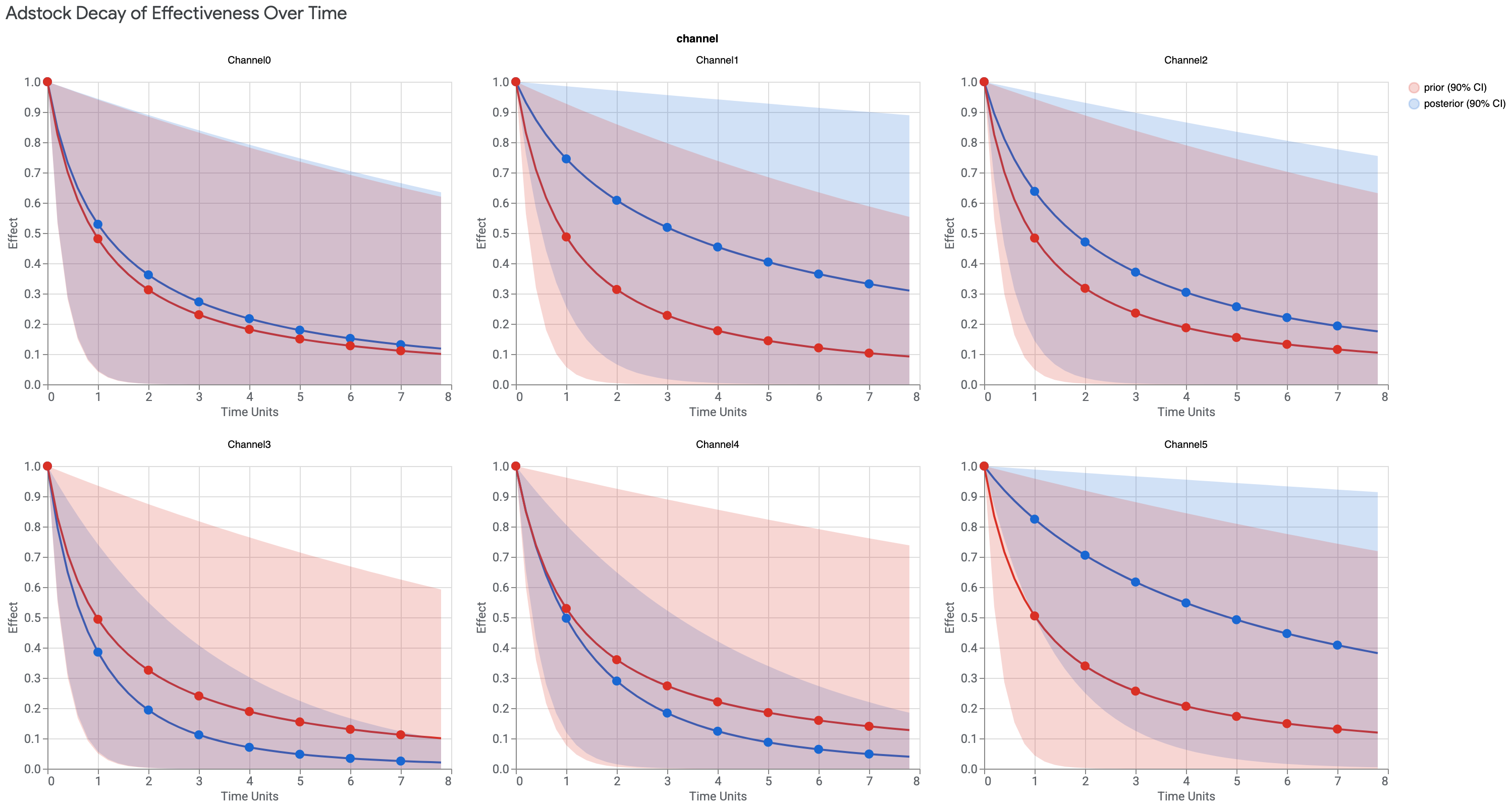 • メディアの可視化データをプロットします。この方法では、カスタマイズしたプロットを作成できます。一部のプロットは、標準の HTML 出力では使用できません。たとえば、特定のチャネルのデータをプロットしたり、信用区間を変更または削除したり、Adstock の減衰や Hill 飽和曲線を追加したりできます。