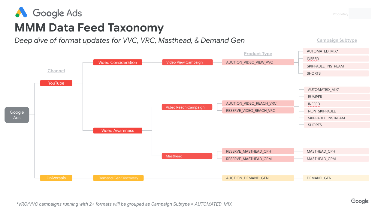 En la siguiente imagen, se muestran los formatos de datos detallados de las VVC, las VRC, el masthead y las campañas de generación de demanda de Google Ads (haz clic en la imagen para agrandarla).