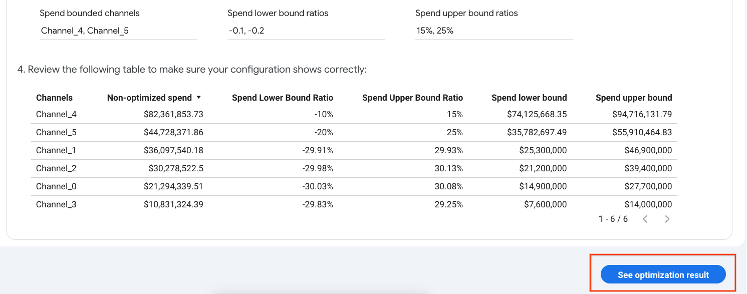 默认情况下,系统会使用整个探索空间来寻找最佳支出分配。在第 3 步中,用户可以添加渠道级额外支出限制,以满足自己的需求。
