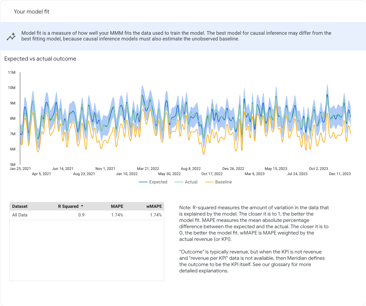 Im Bereich Anpassung Ihres Modells können Sie die statistische Güte der Anpassung prüfen. Diese Diagramme erleichtern die Beurteilung der Modellleistung und geben Aufschluss darüber, wie gut Ihr MMM zu den Daten passt, die zum Trainieren des Modells verwendet wurden.