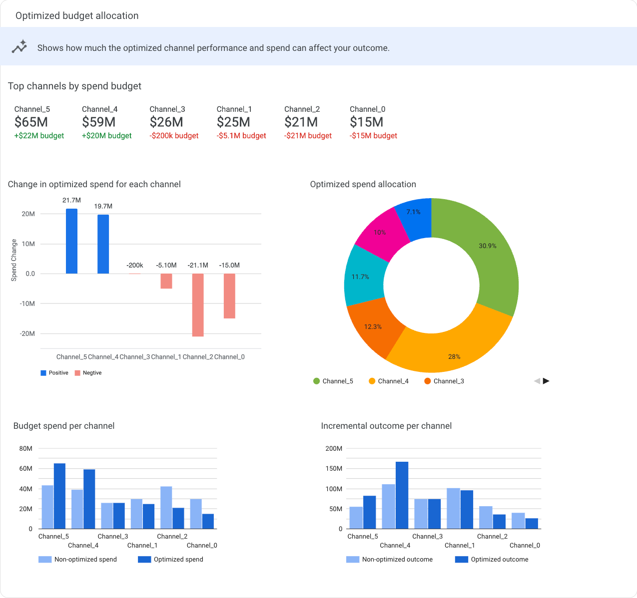 Dieser Bereich enthält eine Zusammenfassungstabelle, in der Sie sehen, wie sich die optimierte Channel-Leistung und die optimierten Ausgaben auf Ihren Umsatz bzw. KPI auswirken können. Außerdem finden Sie dort mehrere Diagramme, in denen die Änderungen der optimierten Ausgaben für jeden Channel dargestellt werden.