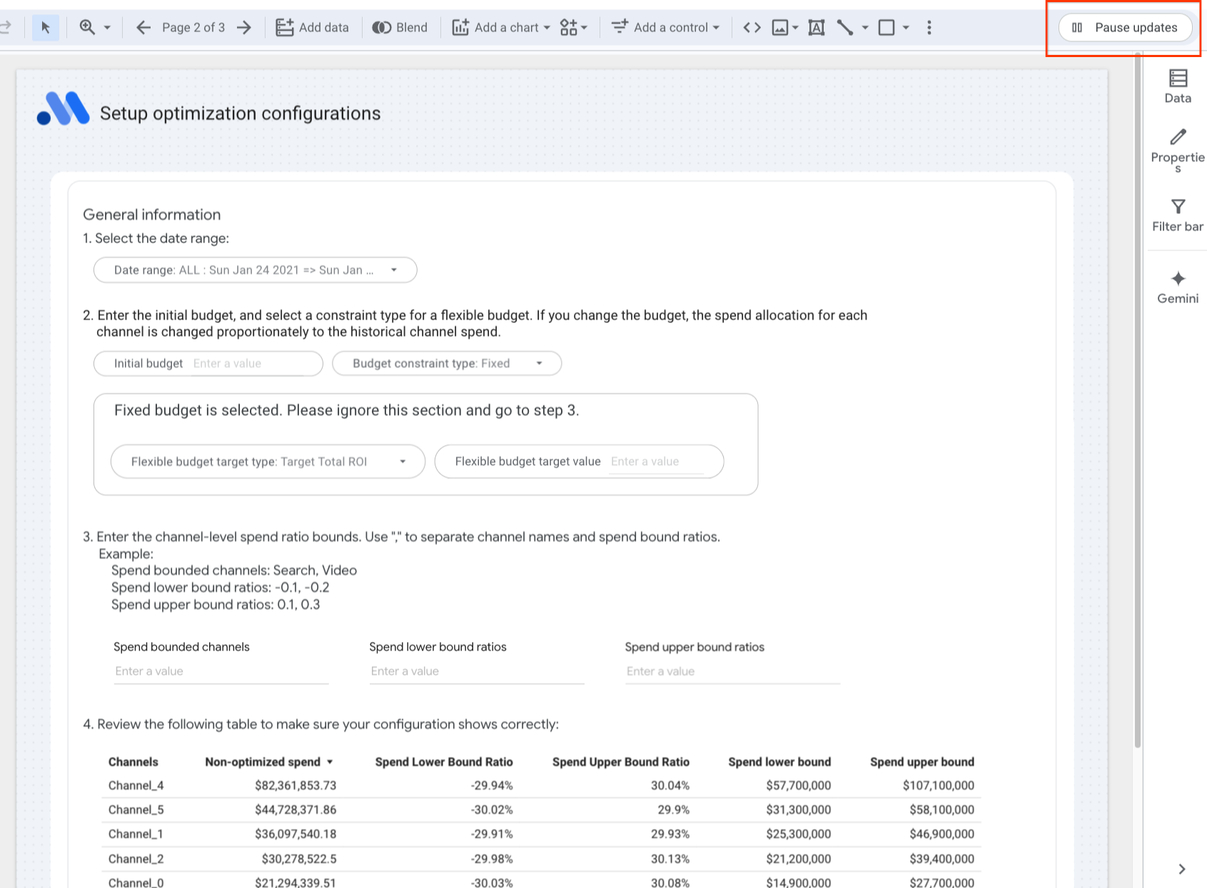 | ‼️ Auf der Konfigurationsseite für die Budgetoptimierung erfolgen Eingaben in mehreren Schritten. Sie vermeiden Konfigurationskonflikte und unnötige Berechnungen, wenn Sie den Bericht im Bearbeitungsmodus öffnen und die Berechnung des Berichts vor der Konfiguration pausieren. Wenn Sie fertig sind, können Sie die Berechnung fortsetzen, um die Aktualisierung des Berichts auszulösen. Weitere Informationen finden Sie unter Aktualisierungen des Berichts pausieren. |