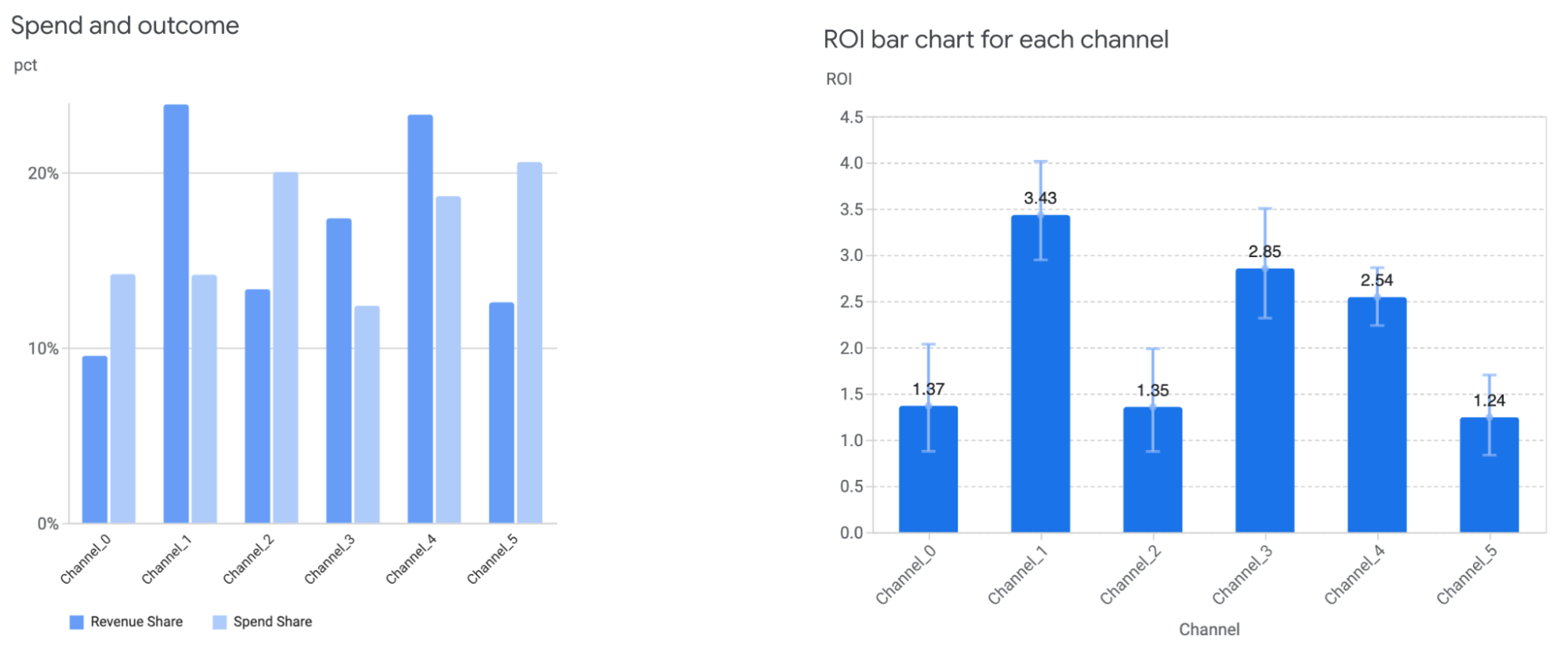 • 支出与效果:显示了每个渠道的媒体支出百分比以及对总增量收入或 KPI 的贡献百分比。有关示例,请参见图 13(左)。此图简要展示了渠道的相对规模和效果。