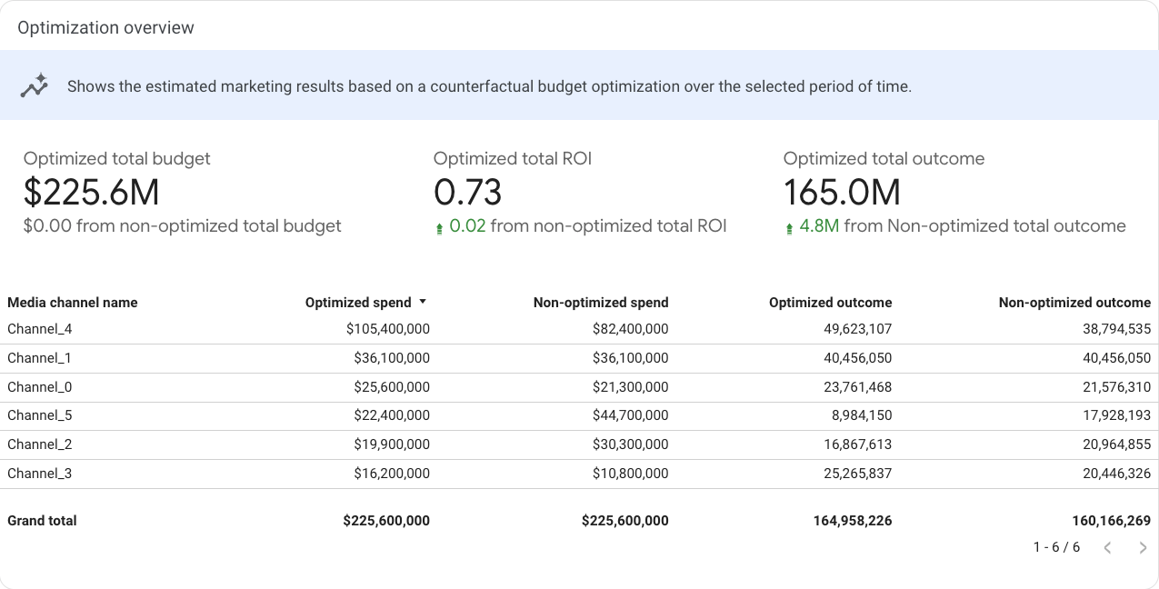 “优化概览”部分是一个汇总表格,其中显示了您指定时间段内优化后的总预算、总投资回报率和总效果(KPI/收入)与未优化数据的对比情况。此外,此部分还会显示渠道级优化后和未优化的支出及效果。